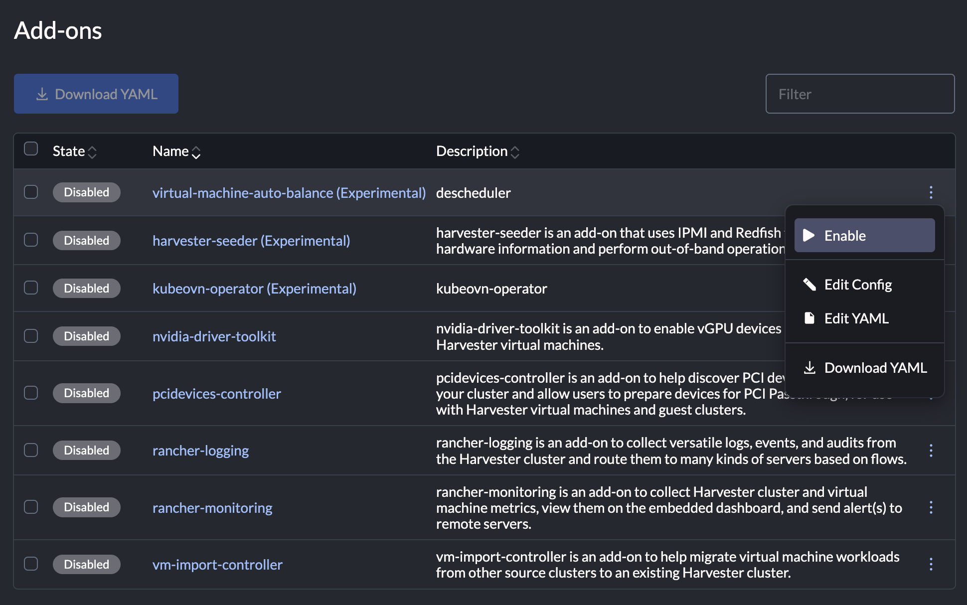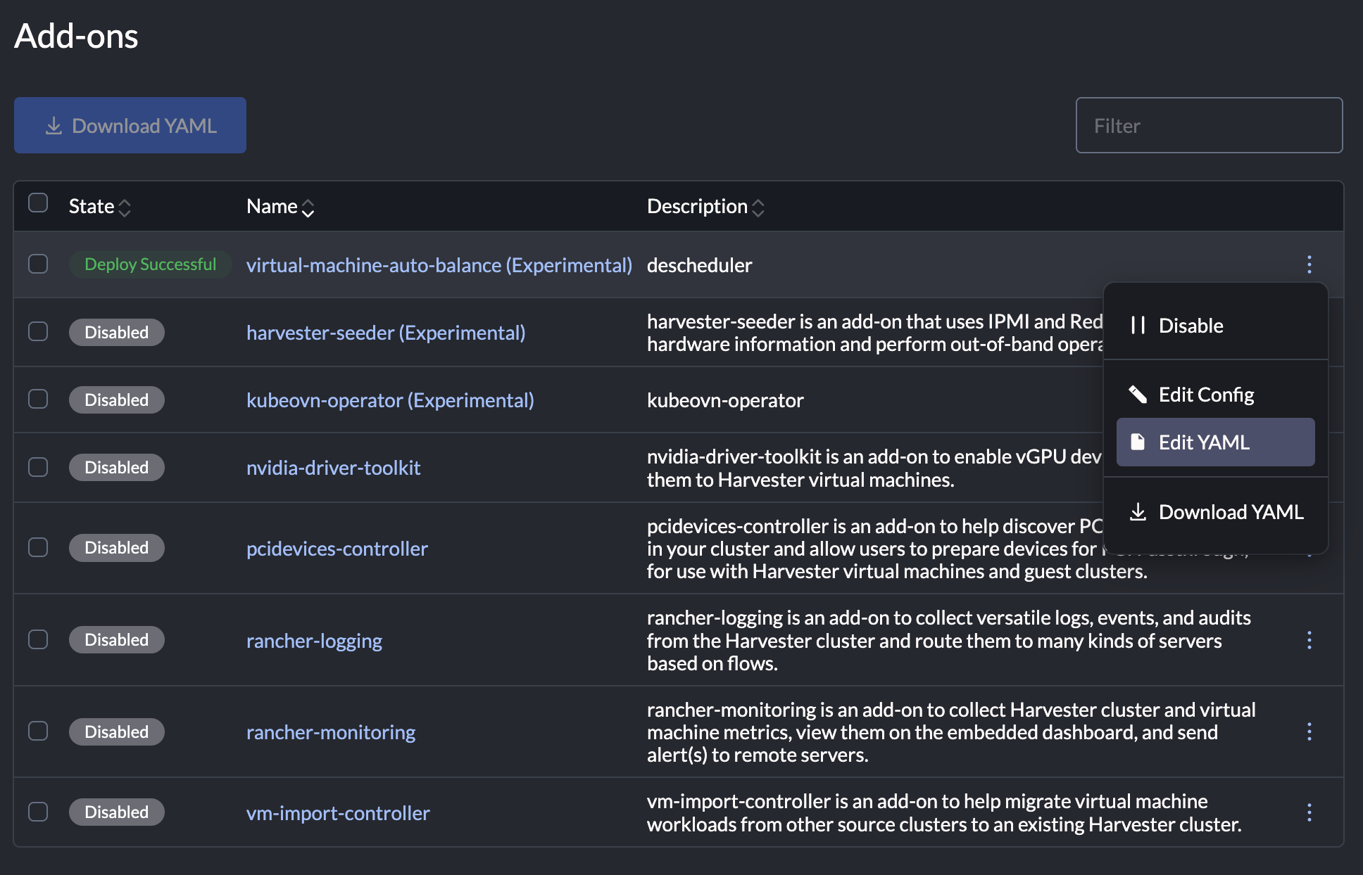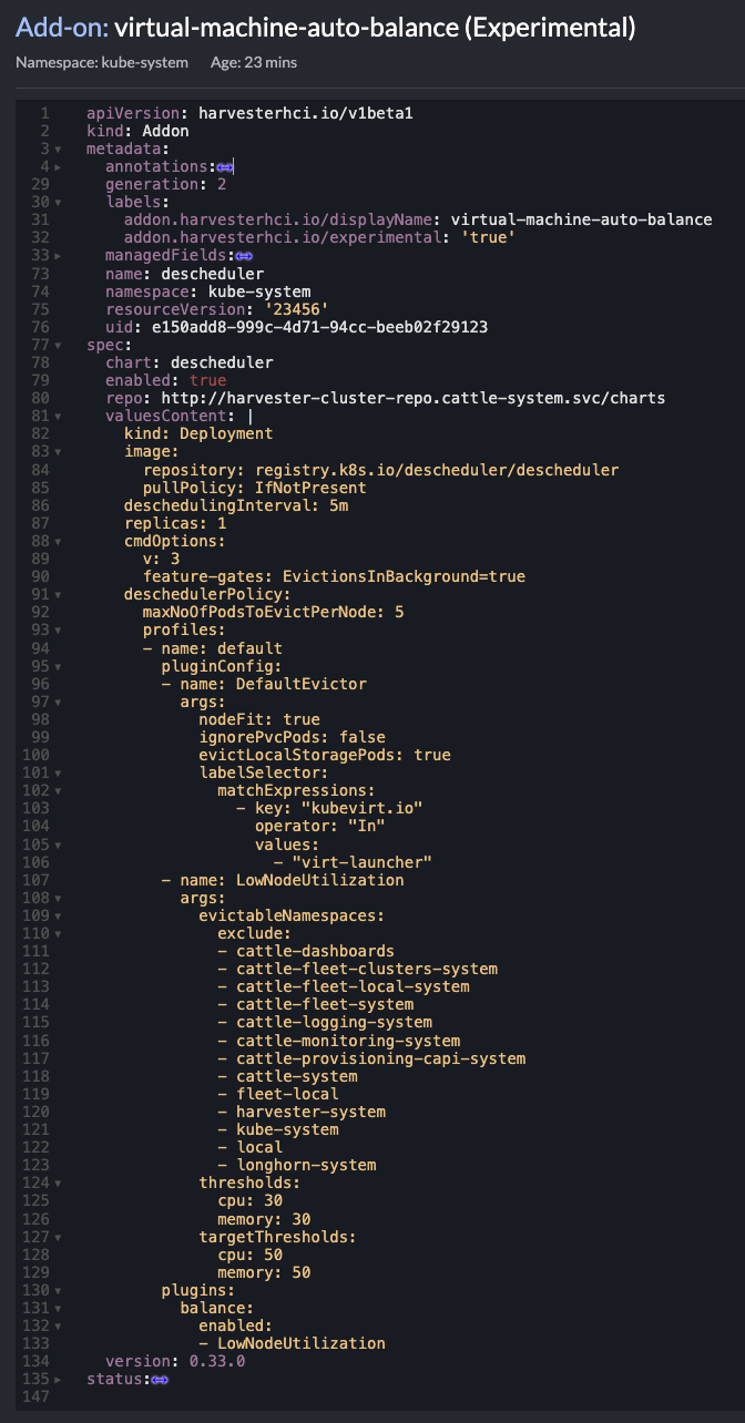 The Virtual Machine Auto Balance add-on allows Harvester to leverage the Kubernetes Descheduler for rebalancing of virtual machine workloads. The Kubernetes Descheduler optimizes workload scheduling by evicting pods that are not optimally placed according to administrator-defined policies. This crucial function enhances resource utilization, balances workloads across nodes, and improves overall cluster performance.