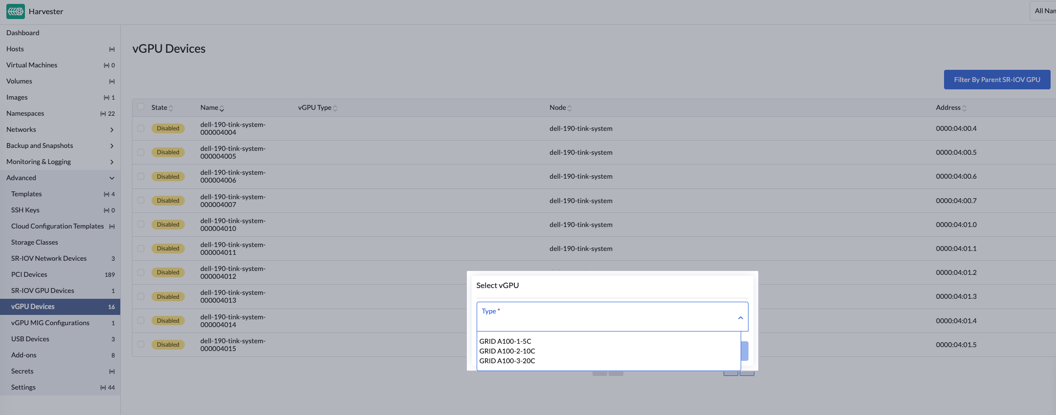 vgpudevices.devices.harvesterhci.ioobjects.Allow some time for the pcidevices-controller to scan the vGPU devices and for the Harvester UI to display the device information.