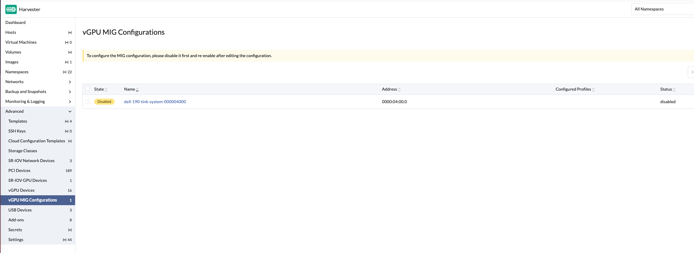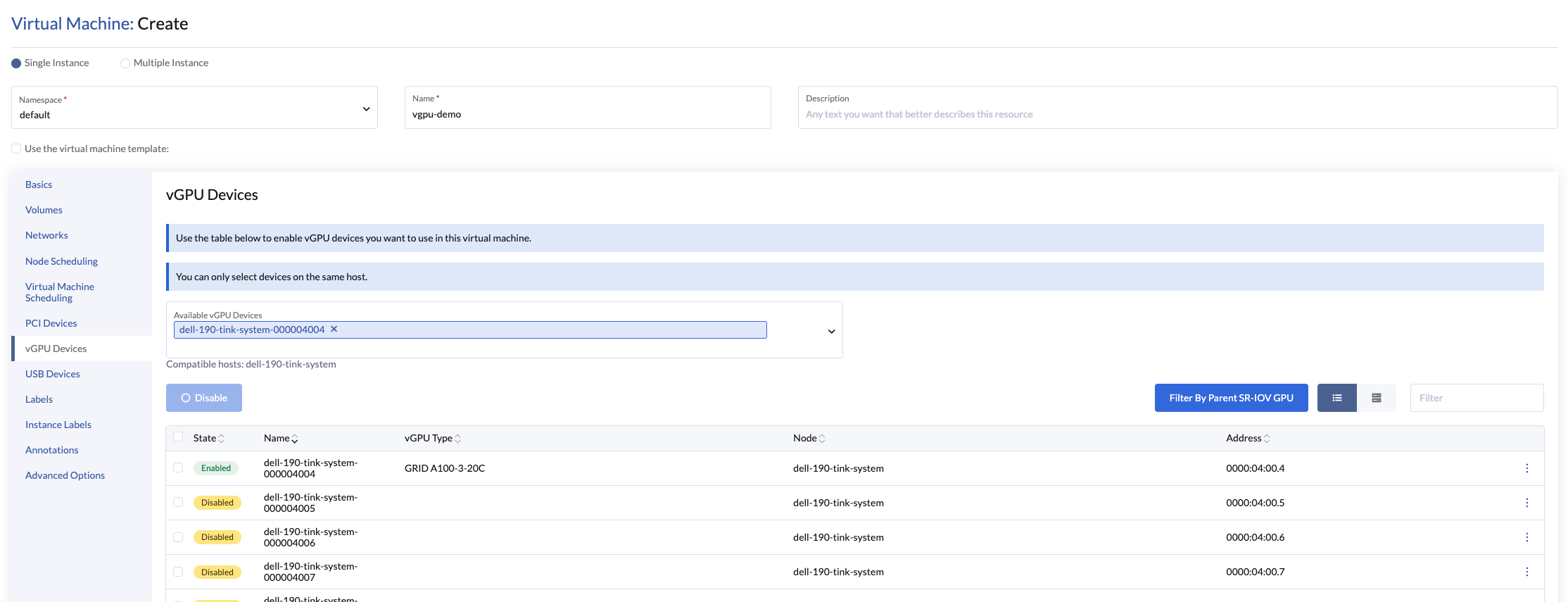 Go to Advanced > vGPU Devices and enable the vGPU device associated with the MIG configuration.