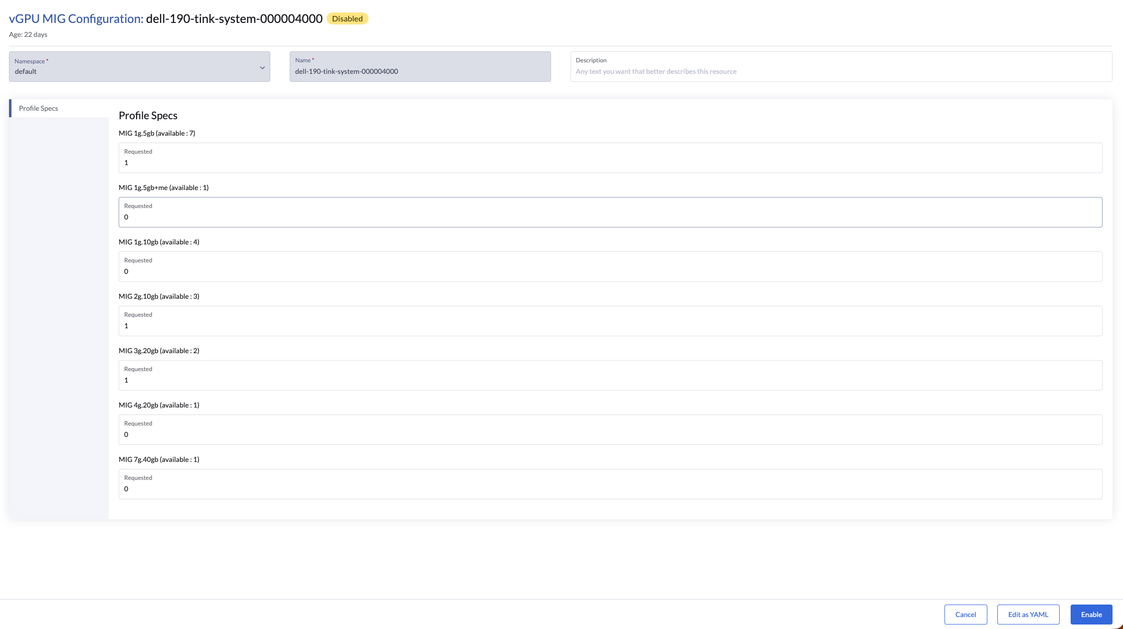 - A MIG configuration has been created for supporting GPU devices.