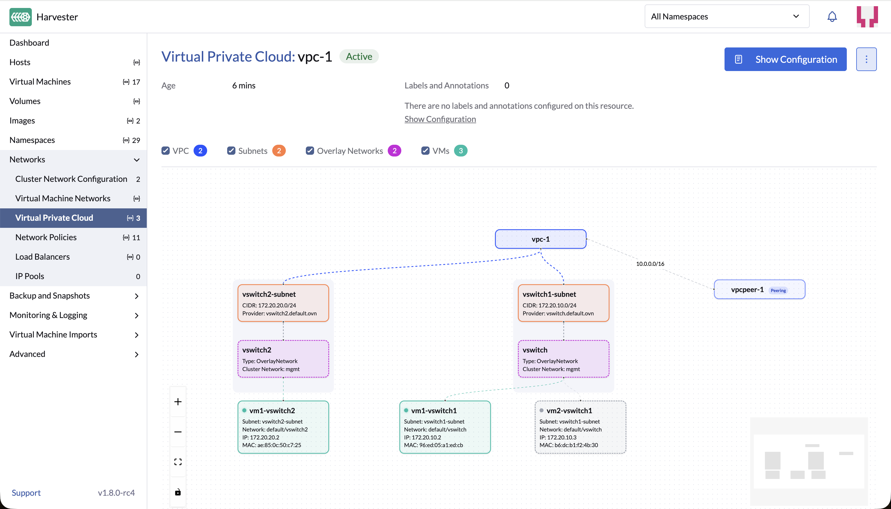 vpcpeer-1andvpcpeer-2.Harvester creates two isolated network spaces that are ready for subnet creation.